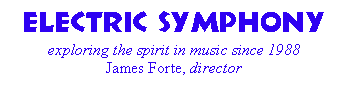 ELECTRIC SYMPHONY was created as a new form of performance ensemble to: liberate musical expression for new and beautiful music make a contemporary platform for new music give a new and true voice to traditional classical music draw upon the great traditions of non-European music make deeply musical use of the new electronic instruments. The ensemble appears in various instrument combinations from four to eight and more players including synthesizers, electronic piano, voice, bass, violin, string quartet, brass choir, and more and launched its first performances and recordings in 1987 and 1988 and its annual summer music festivals in 1990.